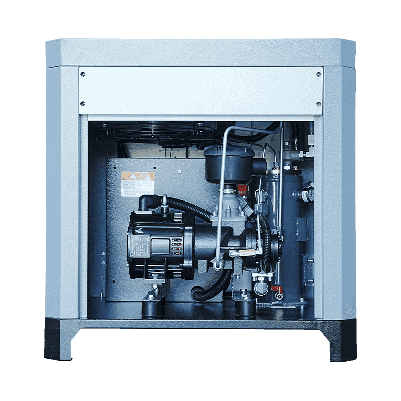 Motorn som driver kompressorn är en oljekyld permanentmagnet synkronmotor, utrustad med högkvalitativa permanentmagneter. En av dess egenskaper är frånvaron av rotorexcitationsström, vilket hjälper till att upprätthålla en stabil effektivitet i hela driftsområdet. Jämfört med traditionella asynkronmotorer är startströmmen för denna motortyp lägre, vilket minskar den elektriska påverkan på elnätet under uppstart. Motorns kylkrets använder samma mikrooljesystem, vilket möjliggör direkt värmeavledning från rotor- och statorytorna. Detta hjälper till att förhindra överhettning, stödjer längre livslängd och säkerställer tillförlitlighet vid tung industriell användning. Den konstanta verkningsgraden och den jämna effektfaktorn gör kombinationen av motor och kompressorblock mycket lämplig för stabil tryckluftsproduktion.